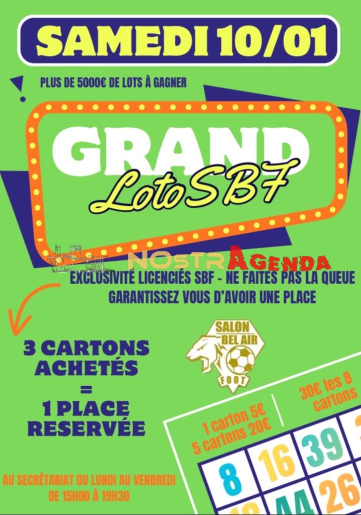 Loto S.B.F – Salon Bel Air Foot Samedi 11 janvier 2025 ouverture de portes à 18h Espace Charles Trenet Buvette et restauration sur place De nombreux lots à gagner SOURCE